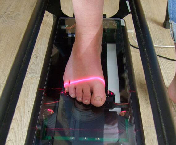 Beide Füße werden nacheinander in wenigen Sekunden ganz genau vermessen. Der Fuß steht dabei auf einer stabilen Glasfläche und wird mit einem Lichtstrahl beleuchtet. Auf dem Bildschirm wird ein dreidimensionales, klinisches Bild des Fußes sichtbar. Der Orthopädie-Schuhmacher erhält die Maße von Ballen, Vorspann, Spann und Ferse. Diese Messergebnisse werden zur Anfertigung eines Leistens aus Holz eingesetzt. Er ist die Ausgangsbasis für die Herstellung individuell angefertigter orthopädischer Maßschuhe, egal ob Alltags- oder Sportschuhe. Sinnvoll ist der Scan auch vor einer Einlagen-Erstversorgung, sowie bei gravierenden Änderungen beim Kunden, z.B. starker Gewichtsabnahme oder -zunahme. Der Scanner ist mobil und schnell einsatzbereit. Im Gegensatz zum Fußabdruck aus Gips kann der 3D-Vollfuss-Scan auch bei kleineren Verletzungen am Fuß durchgeführt werden.